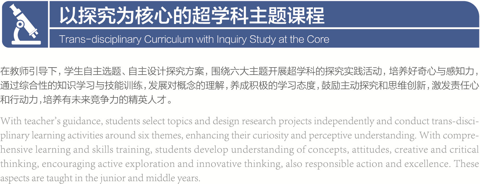 由中國教育科學(xué)研究院及國內(nèi)外教育專家聯(lián)合組成課程研發(fā)團隊,圍繞學(xué)校辦學(xué)理念和育人目標(biāo)設(shè)計開發(fā)北大附屬實驗學(xué)校自主課程體系。借鑒并融合IB國際課程標(biāo)準(zhǔn)和框架,課程理念先進前沿,課程結(jié)構(gòu)科學(xué)合理,課程內(nèi)容豐富多樣,課程特色鮮明突出。