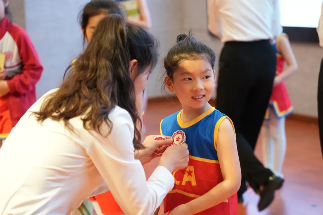 考級(jí)結(jié)束,考官老師們?yōu)楹⒆觽冾C發(fā)徽章及手環(huán)。