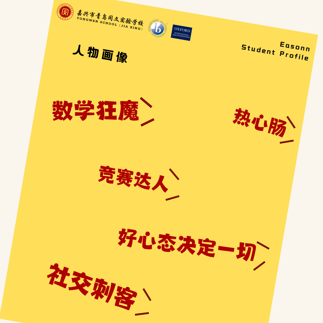Eason是人盡皆知的數(shù)學(xué)大神。10年級剛開始的時候他就自學(xué)完了IGCSE所有的數(shù)學(xué)指導(dǎo),并利用晚自修時間,給同班的六名同學(xué)(??汲煽冊贒)輔導(dǎo)IGCSE數(shù)學(xué),包括幾何、代數(shù)和函數(shù)。所有學(xué)生最后在IGCSE正式考試中都取得了B的成績。11年級的π日,他受邀向小學(xué)生分享了自己的數(shù)學(xué)學(xué)習(xí)經(jīng)驗,利用卡通的形式將復(fù)雜的數(shù)學(xué)問題簡單化。12年級在各個DDL的催促下,他每周還會用一個晚自修的時間帶領(lǐng)10年級的學(xué)弟學(xué)妹們打SIC競賽。即使在壓力爆棚的IBDP全球統(tǒng)考考試期間,他仍會花自己的時間為同學(xué)耐心地講解數(shù)學(xué)題。