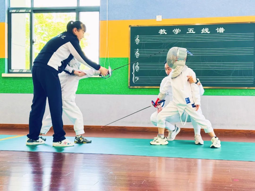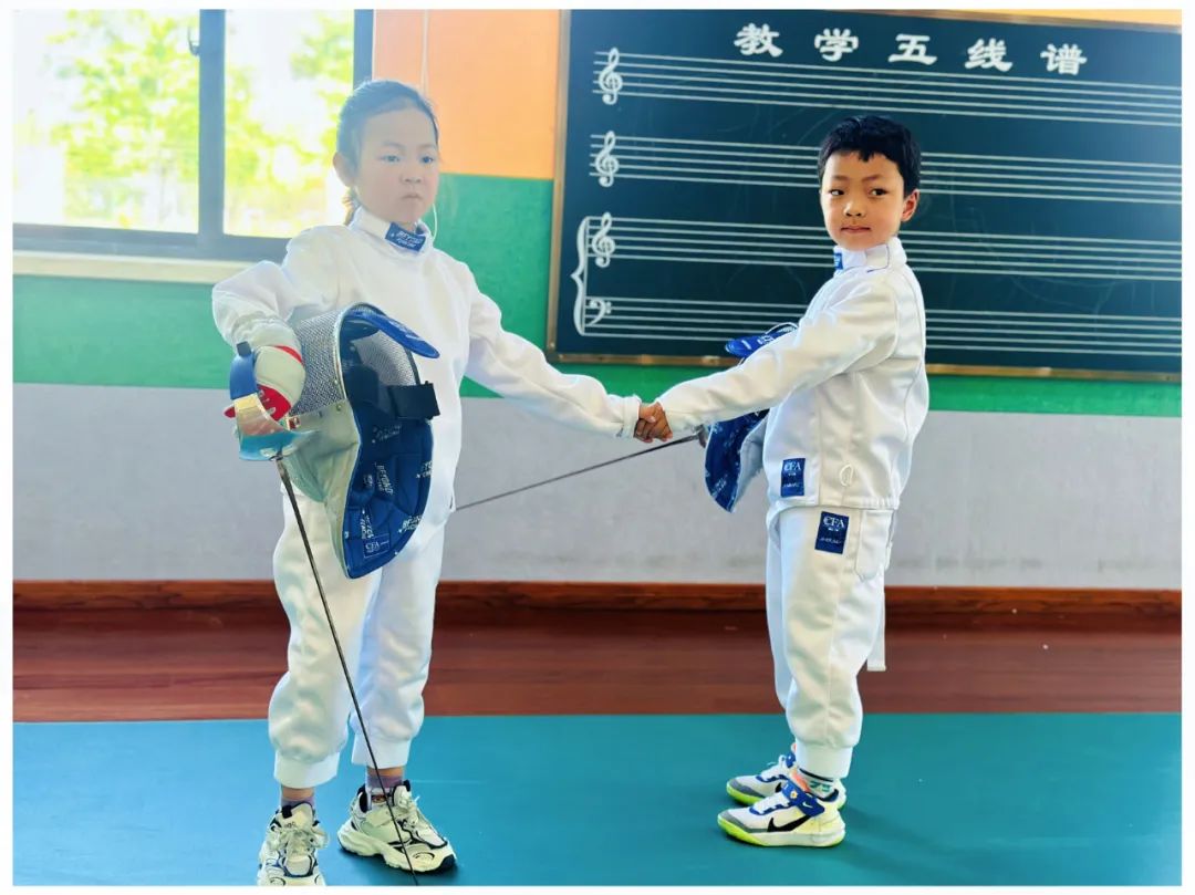 擊劍,輕如蝶舞,疾若蜂刺,是速度力量與智慧的較量,在教練的指導(dǎo)下,孩子們手揮劍,腦思考,他們?cè)谙硎軗魟啡さ耐瑫r(shí),也在感受著同伴之間的搏斗,體驗(yàn)著成功的喜悅。