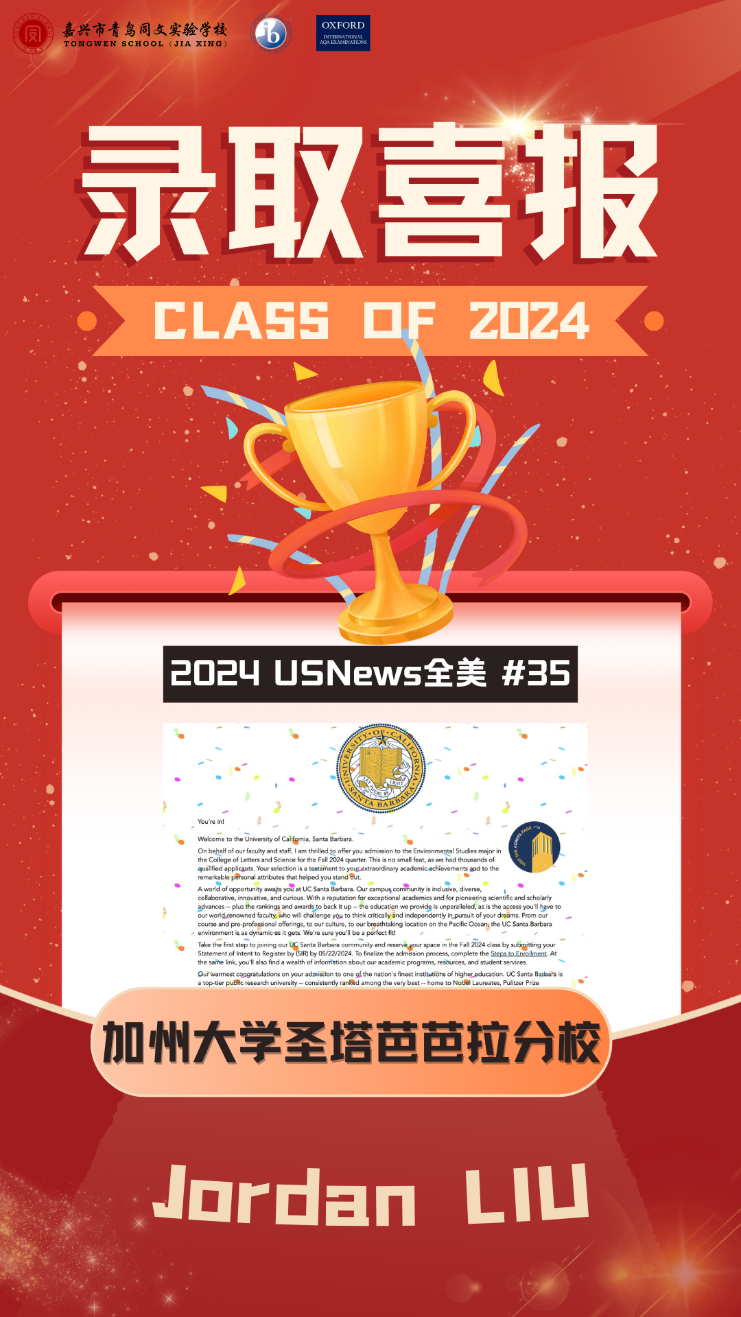 恭喜嘉興市青鳥同文實(shí)驗(yàn)學(xué)校2024屆畢業(yè)生在申請季收官之際收到來自USNews全美綜合大學(xué)排名第35位的加州大學(xué)圣塔芭芭拉分校錄取一枚!這是繼2023屆之后,我們連續(xù)第二年收獲該校的錄?。?/p>